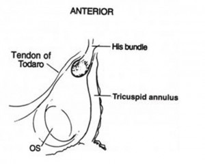 I tre lati del triangolo sono delimitati dall’annulus tricuspidalico ( la porzione dell’annulus adiacente alla cuspide settale), il tendine di Todaro e l’ostio del seno coronarico. Il fascio di His è localizzato all’apice del triangolo . E’ importante sapere che l’apice del triangolo di Koch ( dove si trova il nodo AV e il fascio di His) è una struttura anteriore mentre il seno coronarico è posteriore e definisce la porzione posteriore del setto atriale. Nei pazienti con TRN la via lenta e la via rapida possono essere immaginate come due fasci di fibre atriali: la via rapida è anteriore e superiore ed è localizzata lungo il tendine di Todaro; la via lenta è posteriore ed inferiore e si localizza lungo l’annulus tricuspidalico vicino l’ostio del seno coronarico. Poiché queste due vie sono ben identificabili esse possono essere sottoposte alla procedura d’ablazione. Inizialmente il target dell’ablazione era costituito dalla via rapida, ma essendo questa una struttura anteriore e molto vicina al nodo AV ed al fascio di His si complicava in ca il 20% dei casi con un blocco AV completo. Il target quindi si è spostato sulla via lenta che essendo posteriore e più lontana da strutture sensibili mostra una margine di sicurezza maggiore ( il blocco AV completo in questo caso è descritto in meno dell1% dei casi) . Per l’ablazione della via lenta sono possibili due diversi approccio: tramite mappaggio elettrofisiologico o anatomico. In entrambi i casi vengono prima identificati i limiti anatomici del triangolo di Koch posizionando un catetere sull’His ed uno nel Seno coronarico. Il catetere ablatore viene poi fatto avanzare attraverso la vena femorale fino all’annulus tricuspidali coi in prossimità dell’ostio del CS. Nel caso in cui si voglia procedere al mappaggio della via lenta il catetere ablatore viene mosso accuratamente lungo l’annulus tricuspidalico alla ricerca del potenziale di via lenta che rappresenta la depolarizzazione della stessa. Nell’ ECG endocavitario il potenziale di via lenta si localizza tra la deflessione atriale e la deflessione ventricolare. Quando il potenziale di via lenta viene identificato vengono erogate RF in prossimità di tale sito. In caso di approccio anatomico invece vengono utilizzati i soli reperi fluoroscopici.