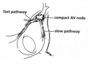 Il nodo atrioventricolare si forma per coalescenza di due fasci di fibre atriali. Questi due fasci non solo hanno proprietà elettrofisiologiche differenti ma sembrano essere due strutture anatomiche distinte; il tratto anteriore corrisponde alla via rapida mentre il tratto posteriore corrisponde alla via lenta. Per meglio visualizzare queste due vie è molto importante conoscere l’anatomia del triangolo di Koch.