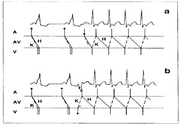 La AVRT è una aritmia rientrante ed è classificata in varianti ortodromiche e antidromiche. Durante la tachicardia ortodromica, la via anterograda è il sistema del nodo AV-His-Purkinje e la via retrograda è la via accessoria. Al contrario, durante la tachicardia antidromica, la via anterogrado è la via accessoria e la via retrograda è il normale sistema di conduzione. La AVRT ortodromica costituisce circa il 95% degli AVRT spontanei e indotti in laboratorio. Per l’inizio della tachicardia, un complesso prematuro atriale (APC), spontaneo o indotto dalla stimolazione, si blocca sulla via accessoria e viaggia lungo il nodo AV-His-Purkinje. L’impulso condotto raggiunge il ventricolo e ritorna sull’atrio sulla via accessoria, che ora ha recuperato la sua eccitabilità. L’impulso quindi rientra nel sistema AV-His-Purkinje, perpetuando la tachicardia. La tachicardia ortodromica può anche essere iniziata da un complesso ventricolare prematuro (PVC). In questo caso, il PVC blocca il sistema His-Purkinje ma viaggia sulla via accessoria fino all’atrio. Se il sistema AV-His-Purkinje del nodo ha recuperato l’eccitabilità, l’impulso quindi viaggia lungo il nodo e rientra nel ventricolo e viene avviata la tachicardia ortodromica