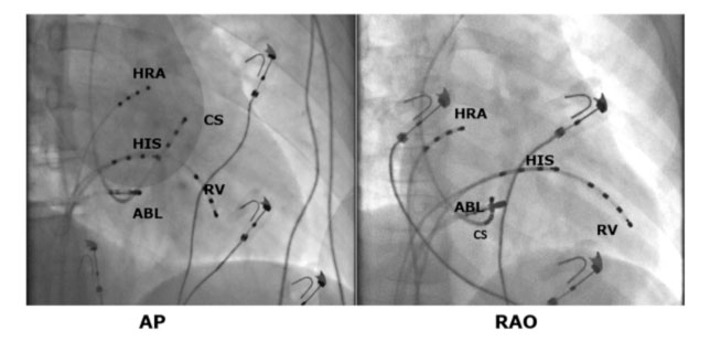 Gli elettrocateteri diagnostici quadripolari vengono posizionati a livello dell’atrio destro alto, del fascio di His, in apice del ventricolo destro e nel seno coronarico (vena cardiaca che circonda in solco atrio ventricolare sinistro e permette di registrare l’attività elettrica nella parte sinistra del cuore).