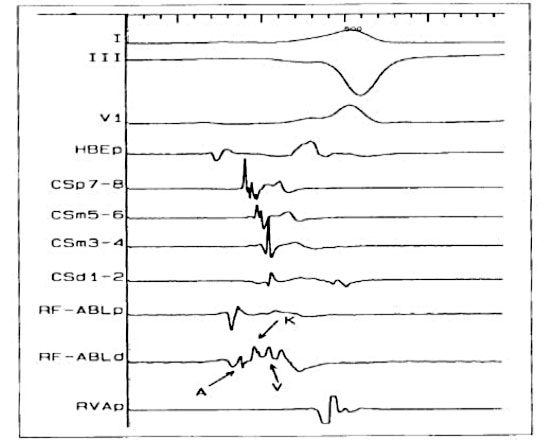 Il primo sito di attivazione atriale durante la conduzione retrograda sulla via accessoria (stimolazione ventricolare, AVRT ortodromica) identifica il suo sito di inserzione atriale. Una limitazione della mappatura durante la stimolazione ventricolare dipende dalla possibilità che la conduzione retrograda sul nodo AV possa interferire con l’identificazione del primo sito di attivazione atriale sulla via accessoria (in particolare, vie accessorie settali settali). Le potenziali soluzioni includono la stimolazione a una velocità maggiore (per causare decremento o blocco nel nodo AV), la somministrazione di farmaci che rallentano la conduzione nodale AV o la mappatura durante l’AVRT ortodromica (dove la conduzione retrograda si verifica solo sulle vie accessorie). I criteri per definire il sito per l’ablazione includono: 1) potenziali sulle vie accessorie, 2) il primo sito di attivazione atriale e 3) fusione di elettrogrammi A e V.