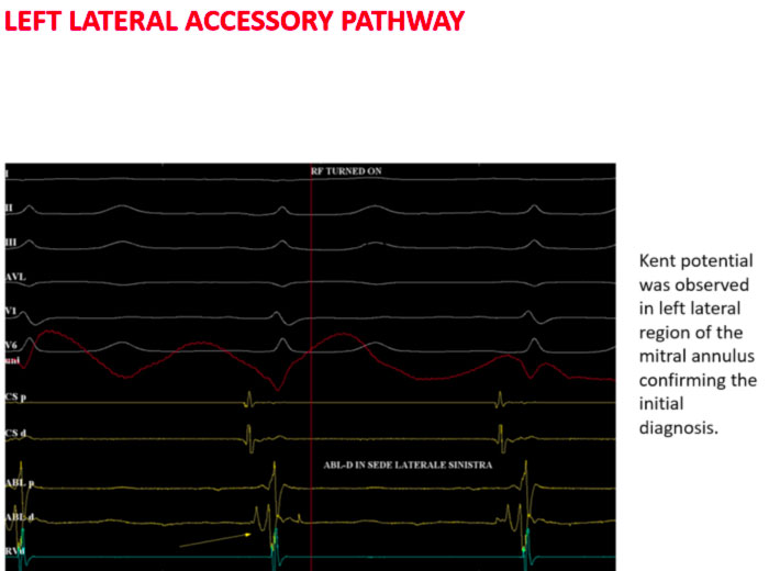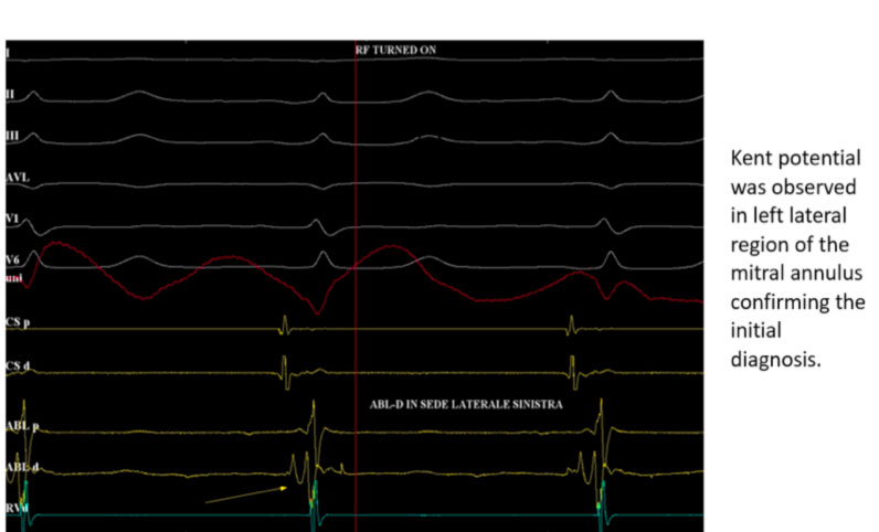 Nel caso di cui sopra ad esempio si posiziona per via trans-aortica il catetere ablatore in posizione laterale sinistra e si registra sul dipolo distale il tipico potenziale di Kent