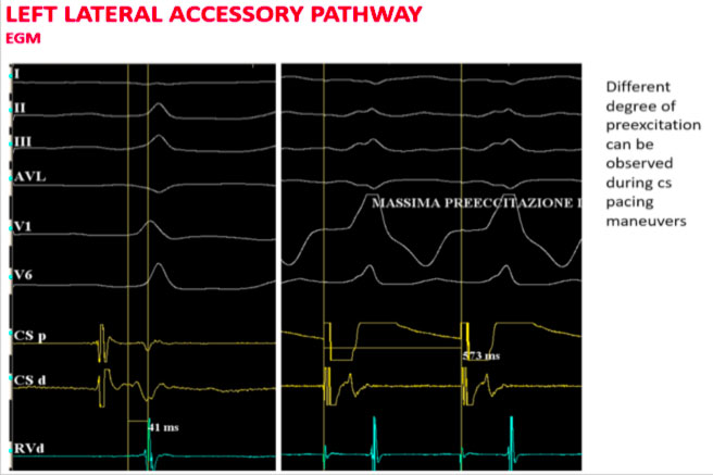 Gli aspetti ECG ed elettrofisiologici che suggeriscono la necessità di un approccio sul lato sinistro includono un’onda delta positiva o un complesso QRS positivo in V1, la prima attivazione atriale retrograda all’ostio del seno coronarico (CS) e un aumento dell’intervallo VA con presenza di BBSX durante la tachicardia ortodromica.